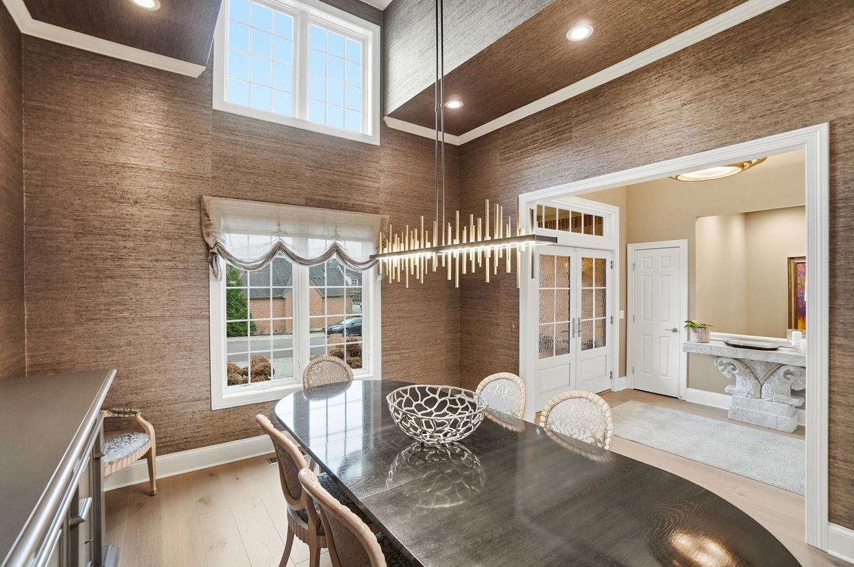 A timeless blend of classic lines and contemporary lighting, the formal dining room has neutral silk grasscloth wallcovering.