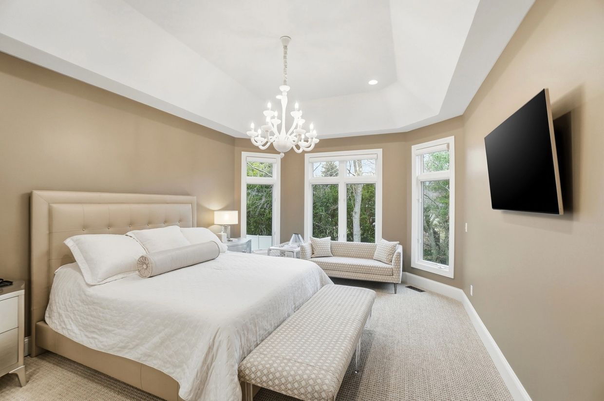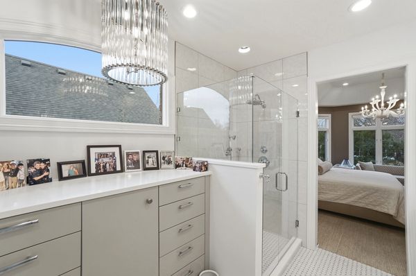 The primary suite at 478 Rue Marseille is a relaxing getaway highlighted by custom shades for the windows with transoms and lovely chandelier. The full bath has a large shower, dual vanity, custom storage, water closet and outstanding finishes.